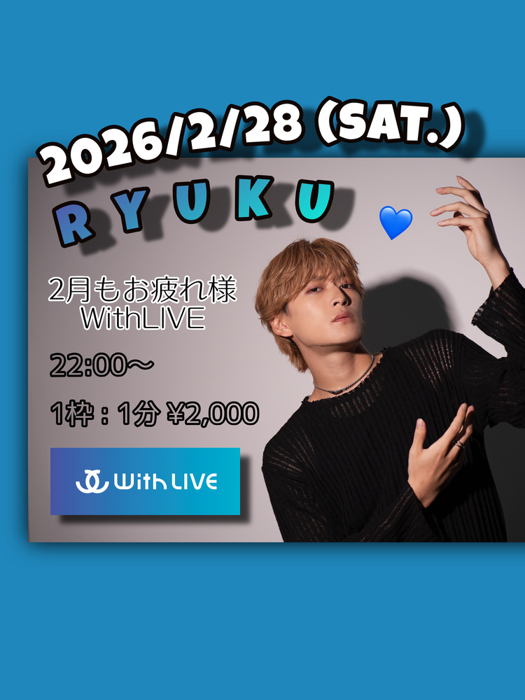 RYUKU 2月もお疲れ様WithLIVE SCHEDULE 2026/02/28(土) オンライン 📣RYUKU WithLIVE開催📣 ・2026/2/28 (sat.) 【RYUKU 2月もお疲れ様WithLIVE】時間 : 22:00〜1枠 : 1分 ¥2,000販売開始日 : 2/10(火)20:00〜 購入はこちらから↓withlive.jp/cast.php?id=iY… URLをコピーする 報告する